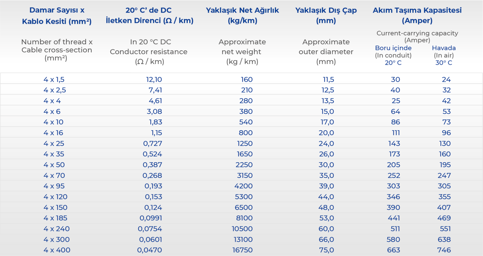 * Çok telli bakır iletken, * XLPE izole, * Halojensiz dolgu * EVA/PE bazlı dış kılıf