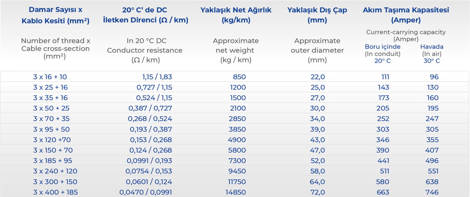 * Çok telli bakır iletken, * Mika bant, * XLPE izole * Halojensiz dolgu, * EVA/PE bazlı dış kılıf