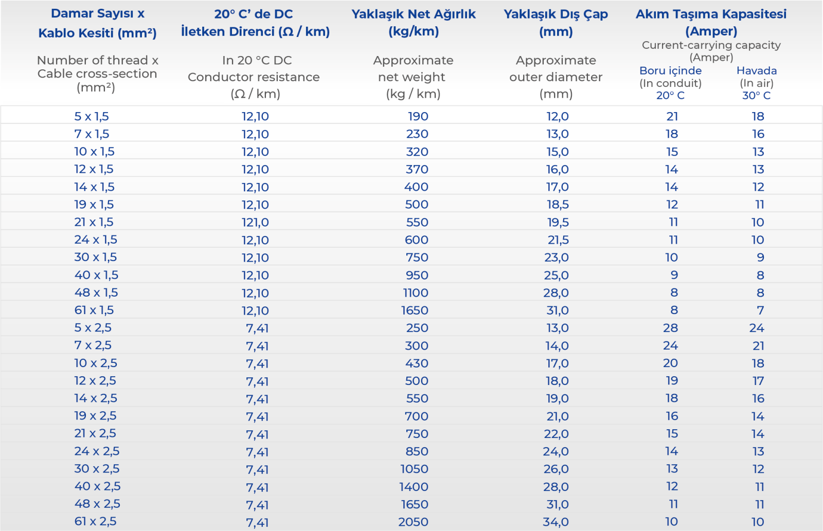 * Bir veya çok telli bakır iletken, * XLPE izole, * Halojensiz dolgu, * EVA/PE bazlı dış kılıf