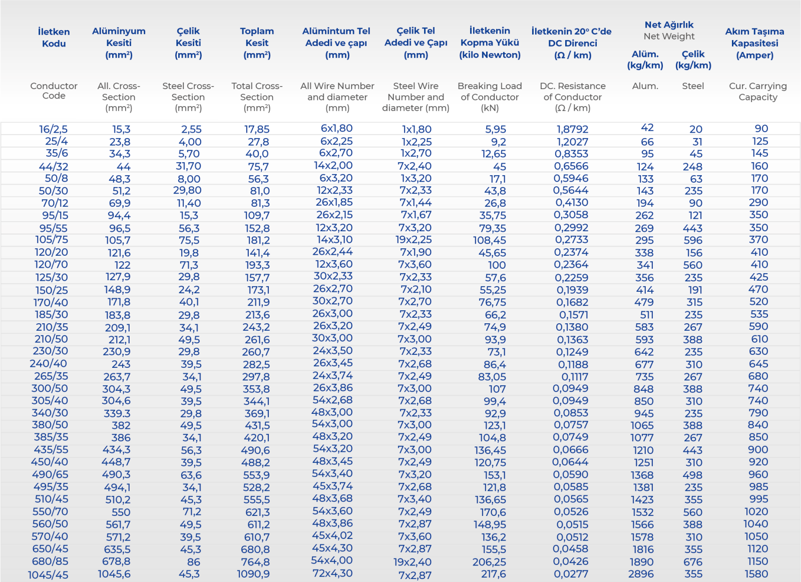 Alçak gerilim dağıtım hatları için çıplak tam alüminyum iletkenler, 15…500 mm² kesitleri arasında TS EN 50182, DIN 48201, ASTM B-230, ASTM B-231 standartlarına göre üretilir. Sipariş iletkenler standard ağaç makaralar üzerinde teslim edilir.